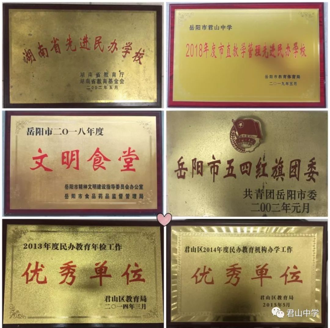 岳阳市君山中学创办于1958年,原为国营君山农场子弟学校,2000年改制为民办普通高中。学校校园面积120多亩,建筑面积4万多平米。有高标准的田径场、篮球场、排球场、羽毛球场及健身房。教学设施齐全,教室安装了现代化多媒体教学设备,可即时上网获取优质教学资源。教室和寝室都装有空调,寝室常年供应热水。学生食堂营养健康,被评为全市十家“文明食堂”之一。校园绿树成荫,鸟语花香,空气清新,生态幽静,是读书学习的好去处。